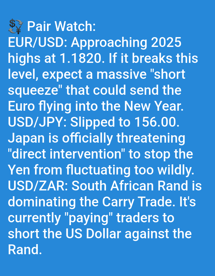 The image is a market analysis piece titled "Pair Watch," covering several currency pairs. EUR/USD is approaching 2025 highs at 1.1820, suggesting a potential "short squeeze" if this level breaks. USD/JPY has slipped to 156.00, with Japan threatening "direct intervention" to stabilize the Yen. USD/ZAR is highlighted, noting the South African Rand's dominance in carry trade, where traders are effectively being "paid" to short the US Dollar against the Rand.
