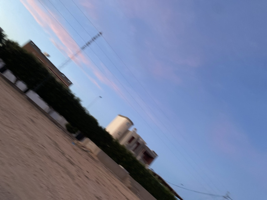 The image, rotated approximately 90 degrees counter-clockwise, depicts an outdoor environment in الغناشة, Tunisia. When viewed upright, the scene primarily features a blue sky with horizontal streaks of pink clouds, suggesting either dawn or dusk. The left side of the frame shows a light-brown, textured ground surface, possibly unpaved, running diagonally from bottom to top. Adjacent to the ground is a dark green, linear mass of vegetation, consistent with hedges or bushes, obscuring parts of the background. Behind the vegetation, several blurry structures are visible. A prominent light-colored building with discernible reddish architectural details is partially visible in the lower-left background. Utility lines are stretched across the sky, with a visible utility pole or tower in the upper-right quadrant. No individuals, specific objects, or actions are identifiable within the blurred scene.