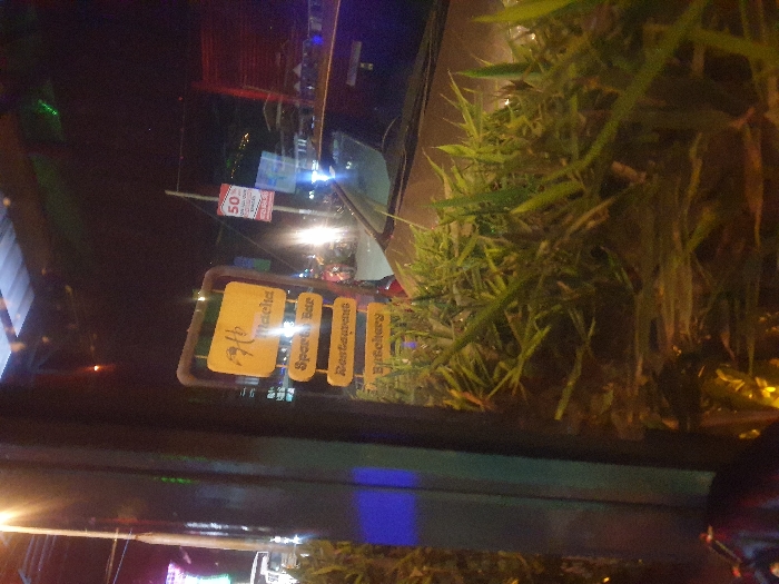 A sign reads "Anticipate" followed by "Sports Bar," "Restaurant," and "Bakery." A "50%" sign is visible in the background, along with street lights. The foreground shows a blurry combination of foliage and a window frame reflecting blue and green light. The overall image is dark and blurry, suggesting a night scene or a low-light environment.
