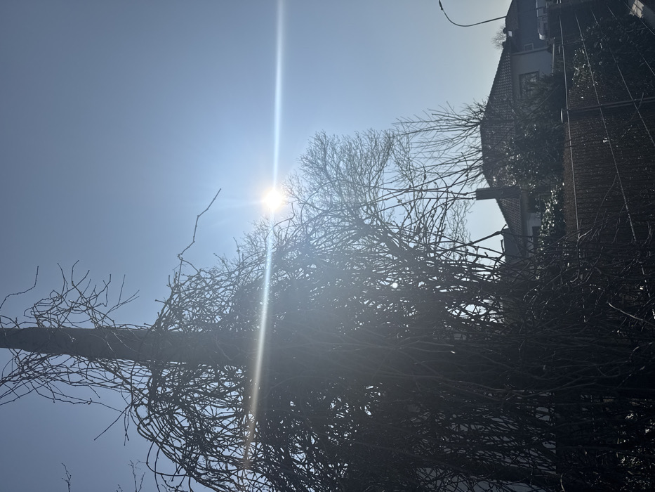 The image captures an outdoor scene in Echzell, Germany, under a clear, bright blue sky with direct sunlight. A dense, intertwined mass of leafless woody vines or branches dominates the left and central foreground, appearing to climb a central vertical support structure. The sun is prominently positioned in the upper center-right, generating a distinct horizontal lens flare across the image. Through and behind this foreground foliage, a light-colored residential dwelling with a reddish-brown tiled roof and an exposed chimney is partially observable in the midground. A dark-colored wire fence horizontally segments the lower midground, behind which bare hedges and the residential structure are situated. Portions of an additional building and a street lamp pole are discernible in the far right background. The scene is devoid of human presence or discernible activity.