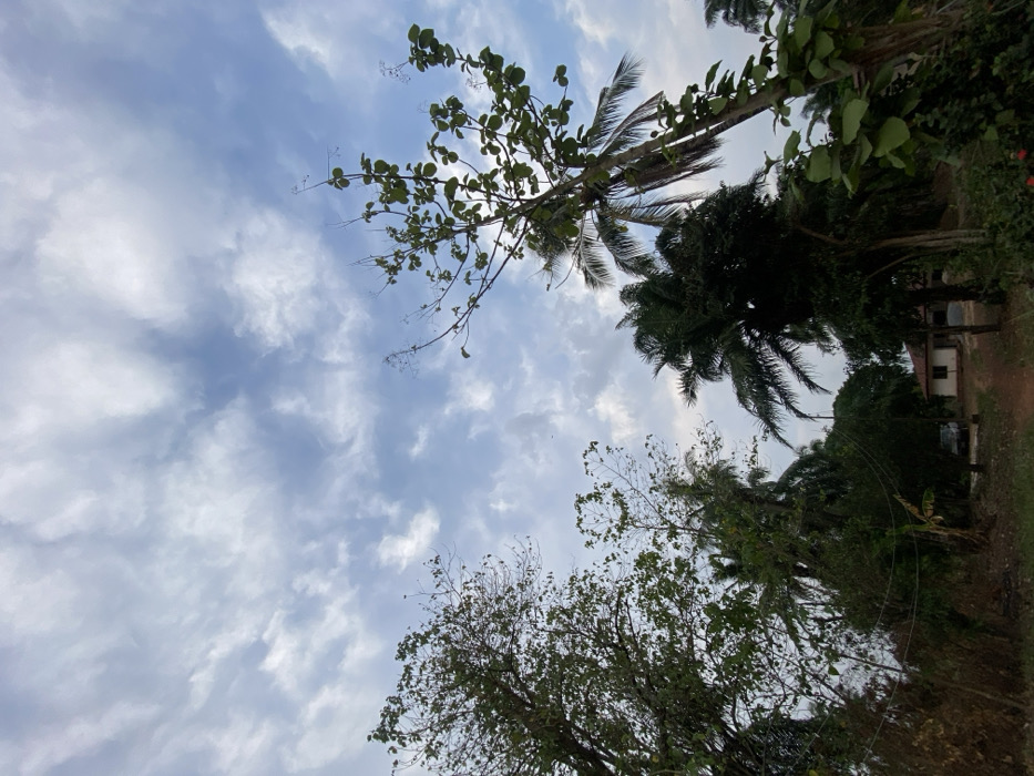 A low-angle shot captures a cloudy sky interspersed with tree branches. A palm tree dominates the top right corner. Other various trees with different foliage are scattered throughout. The horizon line appears on the right side of the frame, where a structure is partially visible amidst dense greenery. The image gives a sense of looking up into a natural landscape.