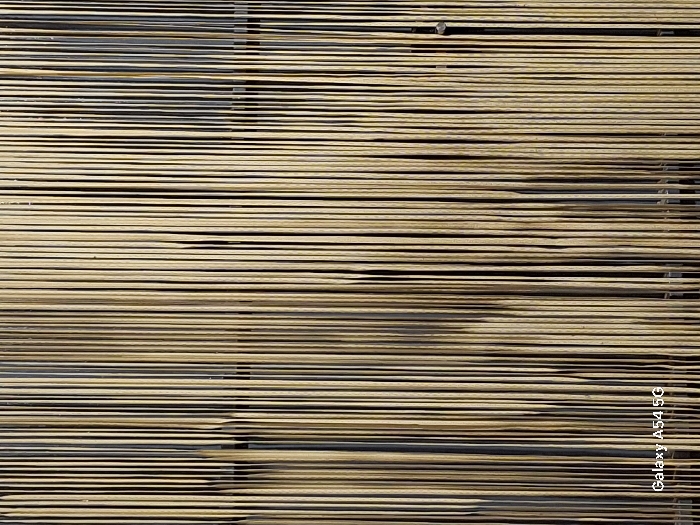 A textured background of horizontal lines dominates the view. The lines are primarily light brown or beige, with dark shadows separating them, creating a striped pattern. The lines seem to be made of natural materials, possibly wood or bamboo, arranged closely together. There's a slight unevenness to the alignment of the lines, contributing to the organic feel of the texture.