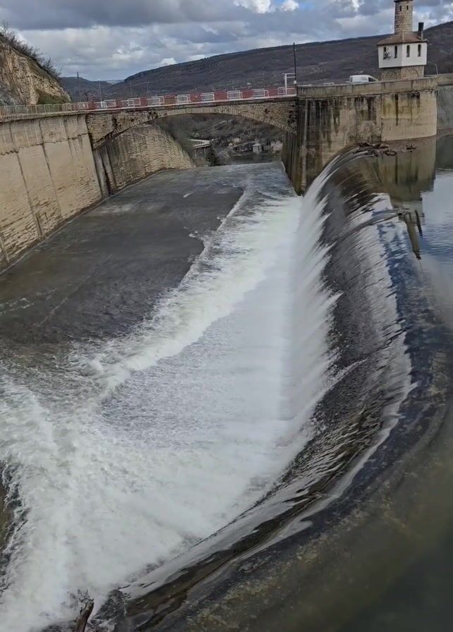 dam with water flowing over its edge, creating a waterfall effect. The dam appears to be made of concrete and has a bridge spanning across it. A small tower-like structure stands on the side of the dam, adding to the architectural landscape. The sky is overcast with dark clouds, suggesting a potentially gloomy day. The surrounding environment seems hilly and sparsely vegetated. The camera angle is positioned at an elevated perspective, providing a comprehensive view of the dam, water flow, and the surrounding landscape.