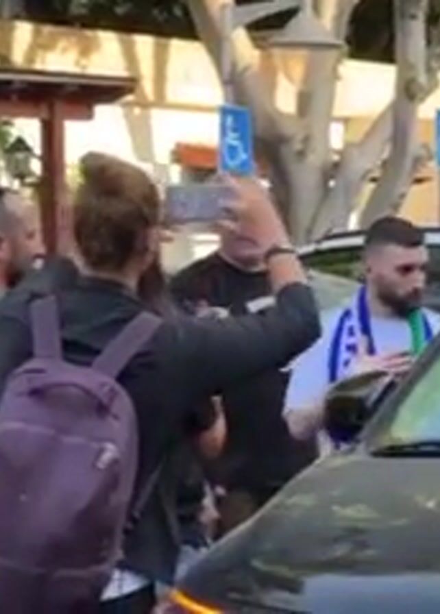 Several people surround a black car, some holding blue and white flags. One person takes a photo of the group with their cell phone. A man stands next to the car, wearing a blue and white scarf. There are handicapped parking signs visible in the background.