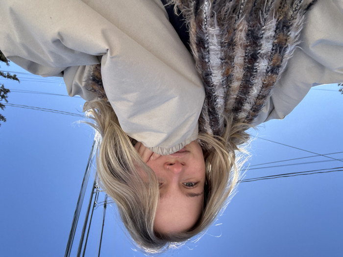 A close-up outdoor selfie of a female subject, taken in Kingston, Canada, under a clear blue sky