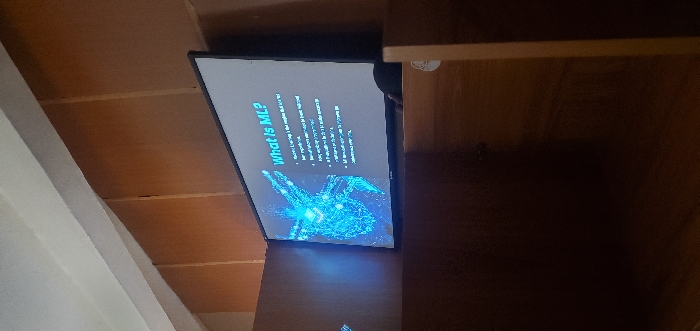 An indoor scene in Jos, Nigeria, features a flat-screen display centered in the upper middle of the frame, presenting a presentation slide. The slide is titled "What Is ML?" (likely Machine Learning) in the top right. A blue, glowing digital network graphic, possibly depicting a brain or circuit board, occupies the left side of the screen. Bulleted text to the right of the graphic provides definitions, including phrases such as "Machine Learning is the studies that extract knowledge," "is an approach in which computers solve problems," "if a program has learned from experience it will improve its performance," and "ML encompasses a broad range of applications that sometimes referred as AI." The display is recessed into or positioned behind a dark wooden structure that forms a horizontal surface in the lower foreground. The walls behind the screen are composed of light to medium brown wood paneling, featuring vertical seams. A white ceiling or upper wall section angles into the frame from the top left. In the lower right foreground, a dark, indistinct form, consistent with the back of a person's head or shoulder, partially obscures the bottom right corner of the screen. A small white circular object is affixed to the dark wooden structure on the right side, below the screen. The room appears dimly lit, with the screen providing the primary light source.