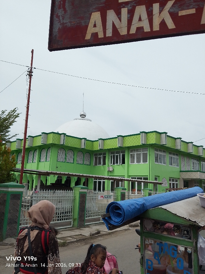 A street view captures a green and white mosque under an overcast sky. In the foreground, a woman in a hijab walks with a young girl past a vendor's cart laden with a rolled blue tarp. The cart's signage is partially visible. A red sign with the word "ANAK" in large letters is positioned at the top of the frame. The scene appears to be in a residential or commercial area with a mix of buildings and infrastructure.