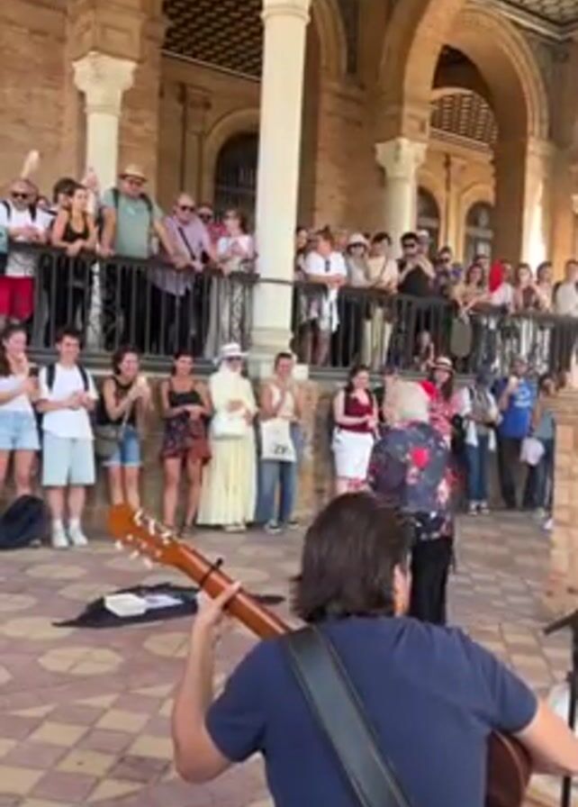 A medium shot captures a lively performance in an ornate outdoor space. In the foreground, a man with long brown hair sits on a stool, strumming an acoustic guitar. Behind him, an elderly woman with short white hair, dressed in a black skirt and a white floral top, energetically dances to the music. She waves her hand at the crowd, visibly enjoying herself. A crowd of onlookers, of varying ages and attire, stands behind a decorative wrought iron railing, applauding and watching the performance. The architecture features high arches supported by white pillars, creating a sense of grandiosity. The ground is covered in patterned tiles, and the overall ambiance suggests a sunny day in a historic location. The camera angle is from behind the guitarist, providing a clear view of the performer and the audience.