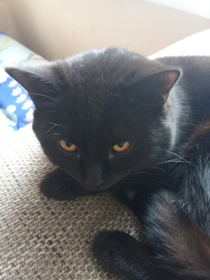 - "A black domestic cat is depicted resting on a textured, light brown/grey upholstered surface, consistent with a sofa or chair" by FM-ULG7s2, licensed under CC BY 4.0