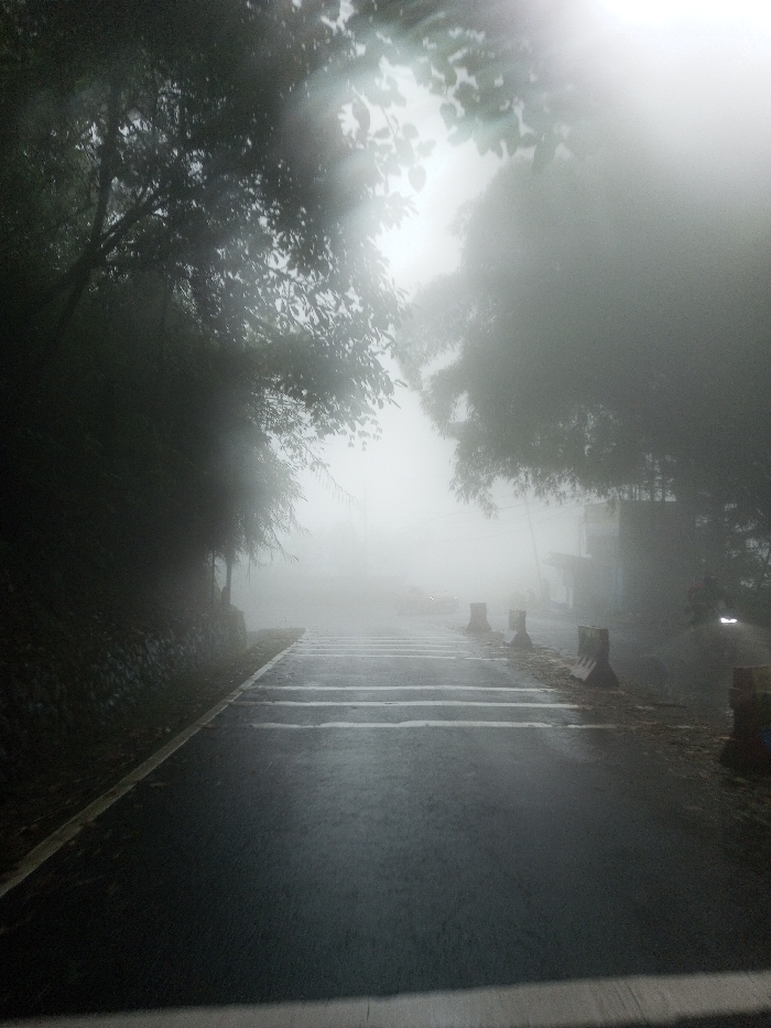 The image captures a foggy road scene in Dawathang_Dorjibi_ Kashingtsawa, Bhutan