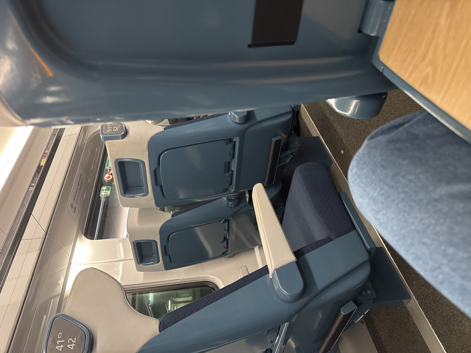 A close-up, upside-down view inside a train car reveals rows of blue and gray seating. Fold-down tables are visible, along with seat number indicators. A person's blue-jeaned leg is partially visible on the right, suggesting occupancy. The interior of the train displays a clean and modern aesthetic.