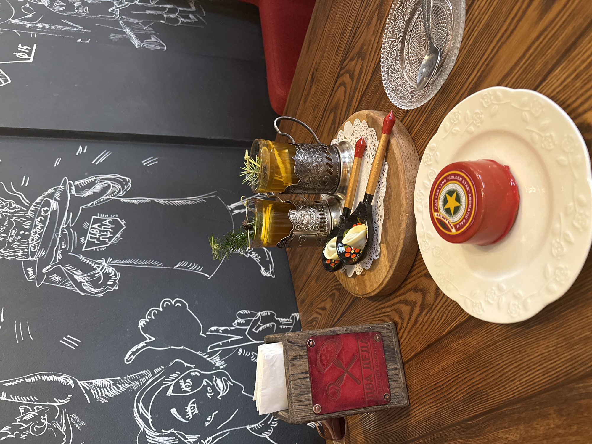 The image captures a table setting in Yekaterinburg, Russia. The table is wooden and showcases various items. Two glasses with metal holders, each containing a yellow liquid, are present, possibly beverages. Nearby, two wooden spoons rest on a small, round wooden serving tray, accompanied by a doily. On a white plate, a round, red object is visible, labeled with “Golden Star Aromatic Balm” and “Cao Sao Vang.” Next to it, there's a clear glass plate with a spoon. A napkin holder made of wood and red leather is positioned near the plate, featuring an inscription in Russian: “ДВА ДЕДА. Пельмени и чебуреки" or "Two Grandpas. Pelmeni and Chebureki," suggesting the location is a restaurant specializing in these dishes. A dark wall serves as a backdrop, adorned with white chalk drawings.