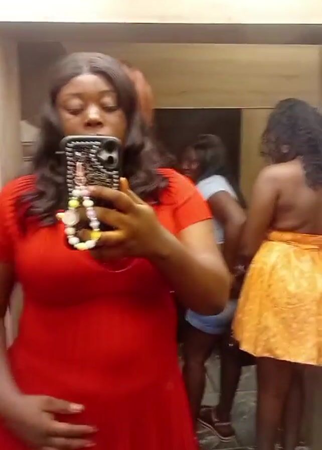 A woman is filming herself in a dressing room mirror with her phone. She is wearing a red dress and has long, dark hair. There are two other women in the background. One is wearing a light blue top and shorts and the other is wearing a short, orange dress. The dressing room is small and has wood paneling.