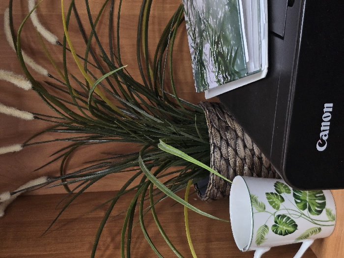 This interior scene, located in the city of Saint Petersburg, Russia, features a desk or shelf arrangement. A tall, artificial plant with slender dark green leaves and multiple light-beige, fuzzy ornamental plumes stands in a dark brown, woven-textured planter, positioned against a light-brown wooden corner. To the left foreground, a white ceramic mug adorned with a green rim and a pattern of green Monstera leaves is visible. A black electronic device, branded "Canon" in white lettering on its front, occupies the lower right foreground. Resting on top of this device is a small stack of papers or a booklet with a cover displaying an abstract green and white pattern, possibly depicting water or foliage. No individuals are present, and no specific street or building within Saint Petersburg is discernible from the visual evidence.