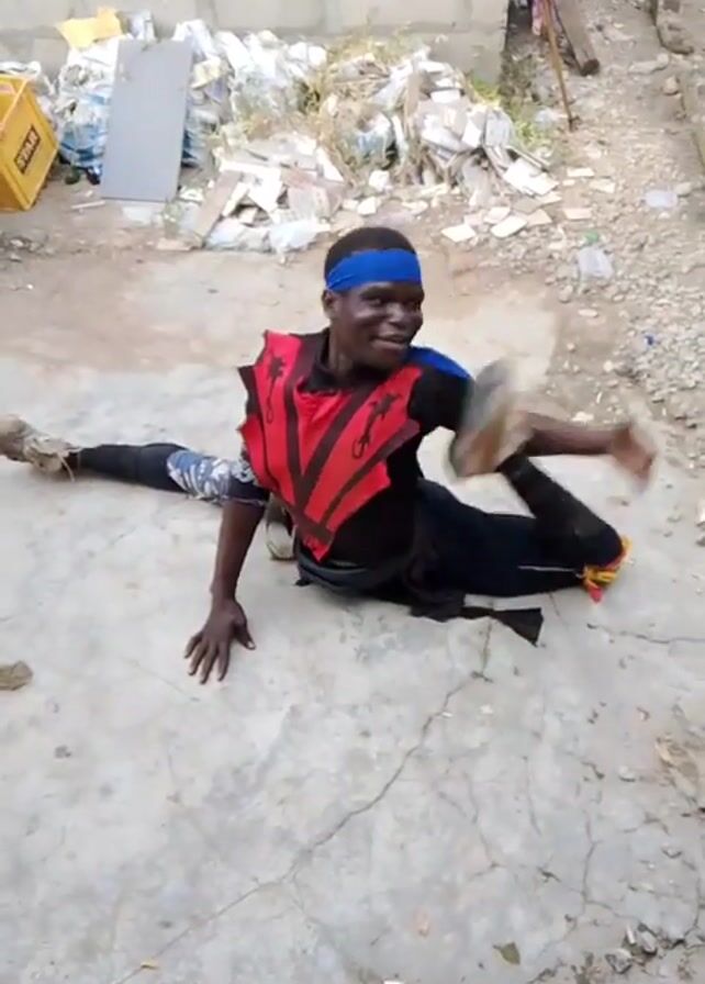 A man in athletic wear is outdoors. He is wearing a blue headband, a black shirt, and a vest. The vest is red with black markings. He is wearing black pants and tan-colored athletic shoes. He has his legs spread as far apart as they will go and his hands on the ground in front of him. He then falls over and ends up lying on the ground. He bends backward and stands up. There is a pile of trash in the background. There is a yellow container with black letters in the background. The surface is concrete.