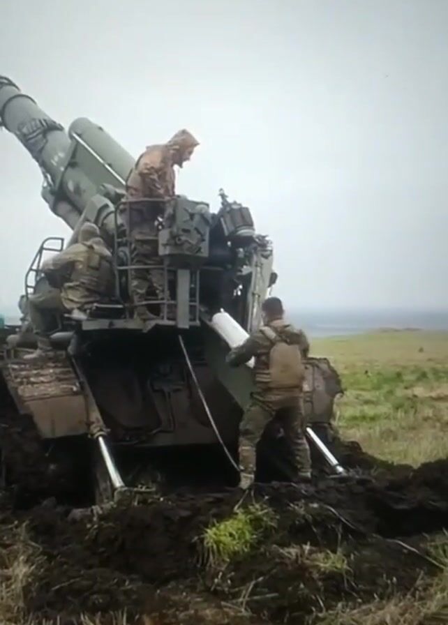 Ukrainian soldiers operating a self-propelled howitzer in a muddy field