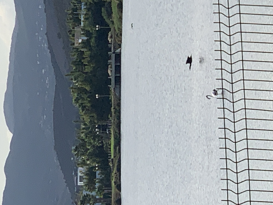 The image displays a panoramic landscape featuring a large body of water, likely Smir Lake or a lagoon in M'diq, Morocco. In the foreground, a black metal fence with vertical bars and V-shaped tops extends across the lower portion of the frame. Beyond the fence, the water surface reflects a muted sky. In the midground water, one light-colored bird, consistent with a flamingo, stands on the left side. To its right and slightly above, a dark-colored bird is captured in flight, wings outstretched, casting a faint reflection on the water. A smaller, darker avian form is visible further in the distance over the water on the right. The background consists of a landmass covered in dense green vegetation, including numerous trees and palm variants. Several light-colored buildings are visible among the foliage, particularly on the left. A multi-arched bridge or water control structure spans a section of the water or land in the mid-background. Twin-lamp streetlights are intermittently placed along the landscaped area. Distant, dark-hued mountains dominate the far background, with scattered small white structures visible on their lower slopes beneath an overcast or hazy sky. No human figures are present in the scene.