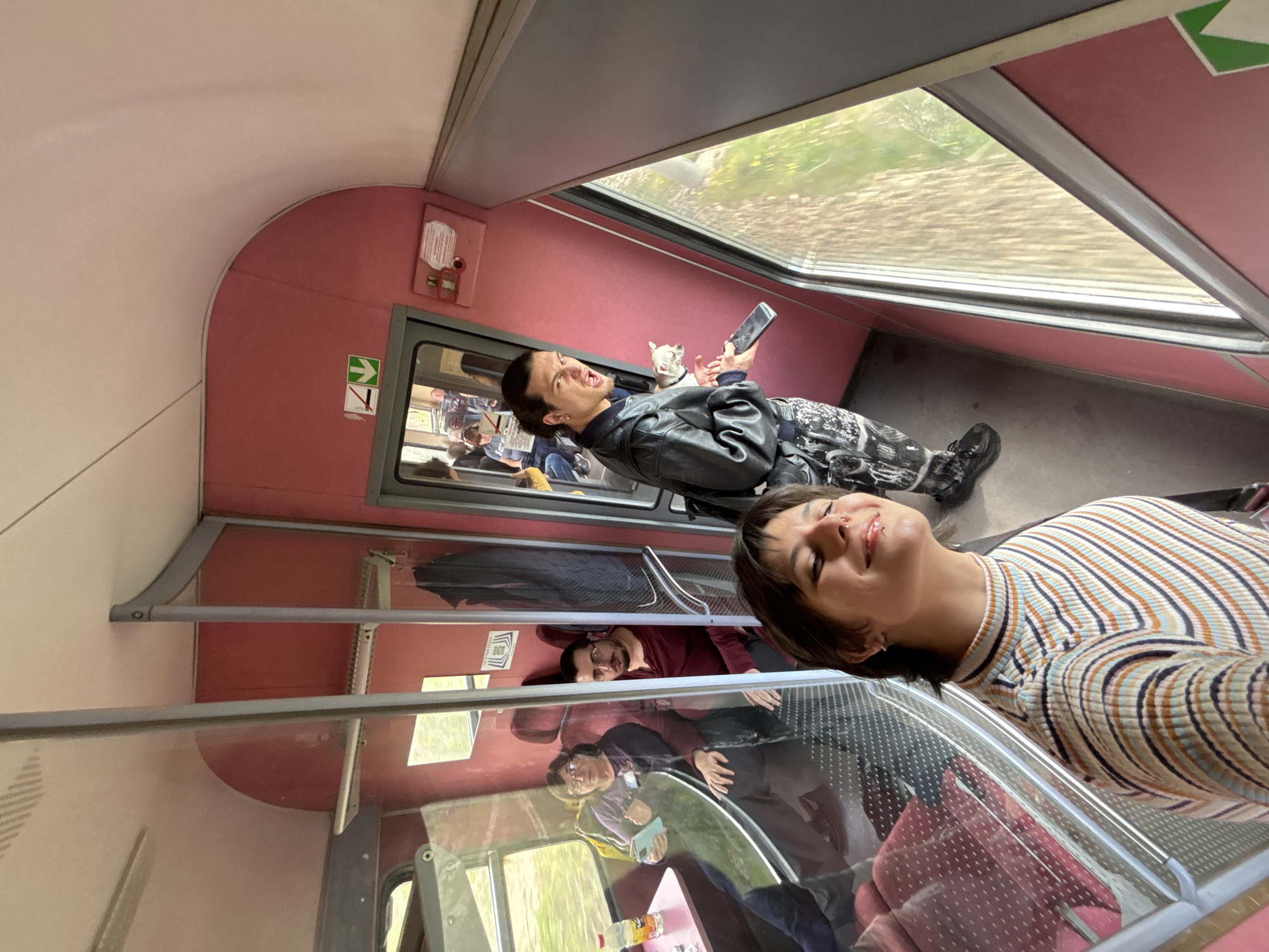 A medium-shot photograph taken inside a moving train in Anevo, Bulgaria. A group of people, four visible, are positioned within the carriage. One person, closest to the camera, wears a striped top and smiles towards the lens. Another person, positioned further back, is seen holding a mobile phone and has a small dog with them. The train's window shows scenery passing outside. The carriage interior is pink, with metal bars dividing sections of seats. Reflections of the passengers are visible in the glass.