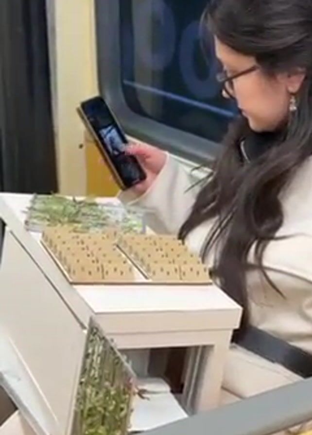 A woman rides on a train, seated next to a white box which appears to hold plant cuttings and some smaller items. The woman uses a cell phone with a gold frame. She is wearing glasses and a white jacket and has long, dark hair. The train is moving, creating motion blur in the background.