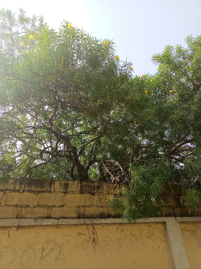The scene depicts an outdoor environment in Fagge A, Nigeria, characterized by a wall and a prominent tree under a clear sky. In the foreground, a textured wall occupies the lower portion of the frame. The upper section of this wall is constructed from tan-colored concrete blocks, exhibiting visible mortar lines and some discoloration. Below this, a smoother, light yellow-beige rendered section is present, topped by a horizontal grey concrete beam. Faint, dark graffiti-like markings, including the letters "OKA," are discernible on the lower rendered section. Thin, dry, vine-like tendrils hang down from the block section. Rising behind and above the wall is a large tree, its trunk and lower branches mostly obscured. The tree features a dense canopy of dark green, elongated leaves and numerous small, bright yellow flowers distributed throughout its foliage. Visible branches are gnarled and interwoven. The top half of the image is dominated by the tree canopy and a bright, light blue sky, indicating daylight conditions. A lens flare is present on the upper left, suggesting the sun's position. No individuals or animals are visible.