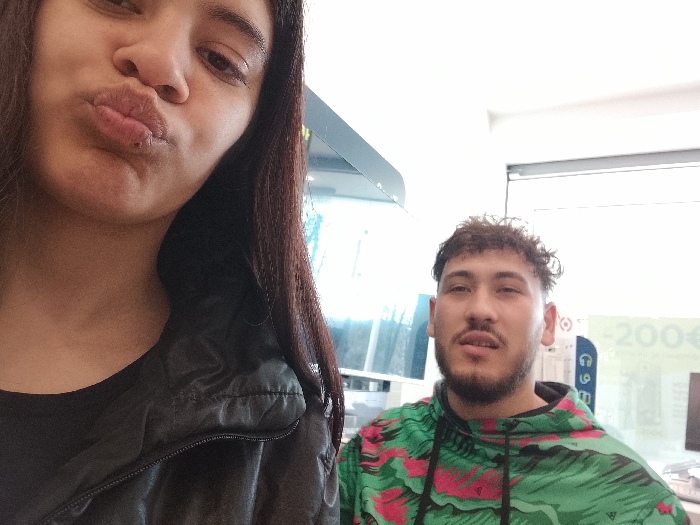 This image captures two individuals in an indoor commercial environment within Mezdra, Bulgaria. The foreground shows a female subject, partially cropped on the left, with long dark hair, puckering her lips towards the camera. She is wearing a black garment. A male subject is positioned behind and to the right of the female, looking directly forward with a neutral expression. He has short, curly dark hair and facial hair, wearing a green and pink patterned hooded sweatshirt. The background is brightly lit, displaying an indistinct commercial interior with reflections and a visible sign fragment featuring "200€".
