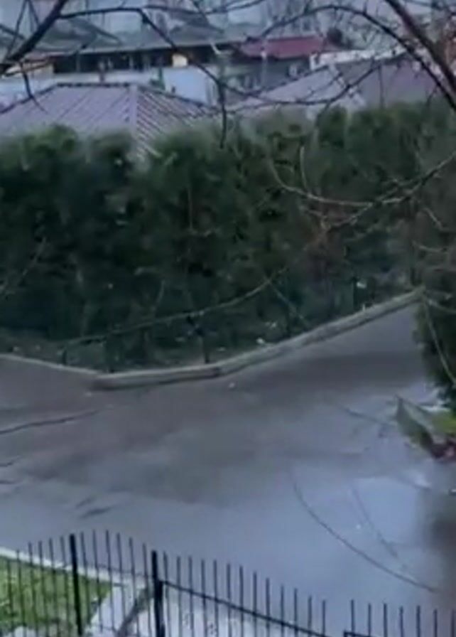 rainy day in a residential area. A wet concrete courtyard is visible behind a black metal fence. Bare tree branches frame the view, and in the background are green hedges, small houses with red roofs, and a large grey building with red accents. The camera is static.