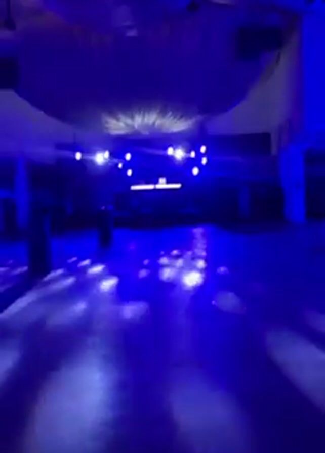 n empty event space with a temporary fabric ceiling, illuminated by colorful dance lighting. The lights alternate between blue and red. The dance floor is empty, and there is a DJ booth in the background.