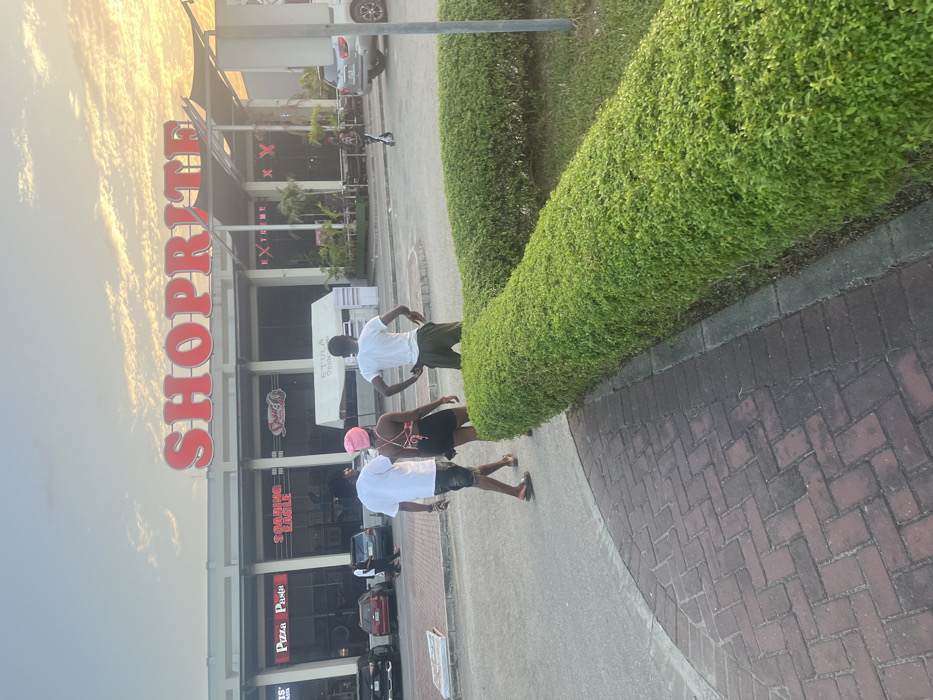 A group of people walks near a shopping center during daytime. The shopping center has the sign "SHOPRITE" prominently displayed, along with smaller restaurant signs such as "Pizza Panda" and "Soaring Eagle." A well-manicured hedge lines the walkway, and cars are parked in front of the building. The sky has scattered clouds.