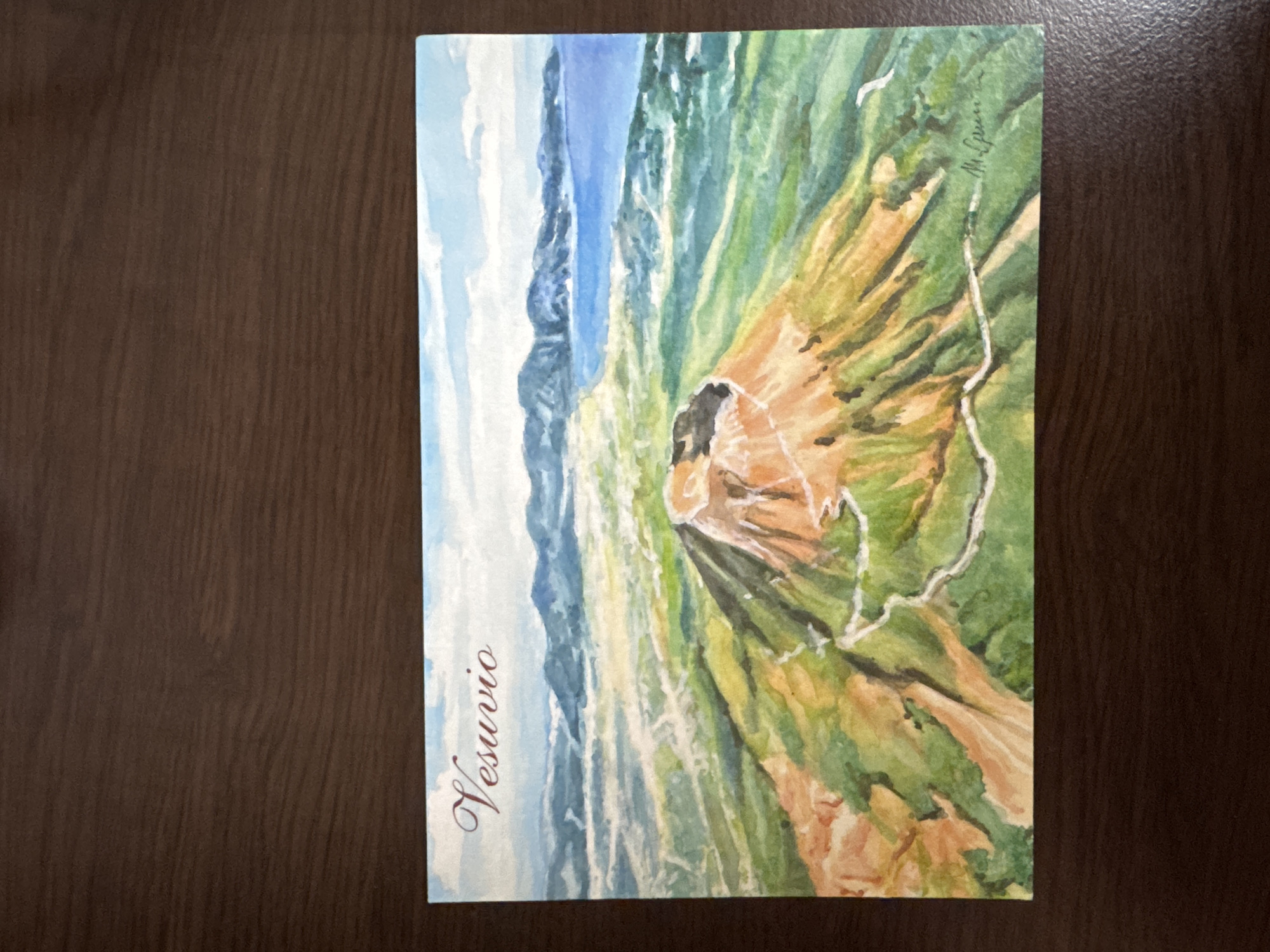 The image is a watercolor painting of Mount Vesuvius. The name "Vesuvio" is written vertically on the left side of the painting. The volcano is depicted with a detailed crater and surrounding landscape, featuring a mix of brown, green, and yellow hues. In the background, there is a suggestion of a coastline and blue sky. The painting is signed in the upper right corner. The physical painting is placed on a dark brown wooden surface. This image has nothing to do with the city of Sofia, Bulgaria.