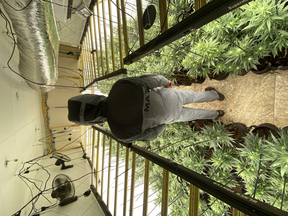 The image displays an indoor cannabis cultivation facility located in Sant Adrià de Besòs, Spain
