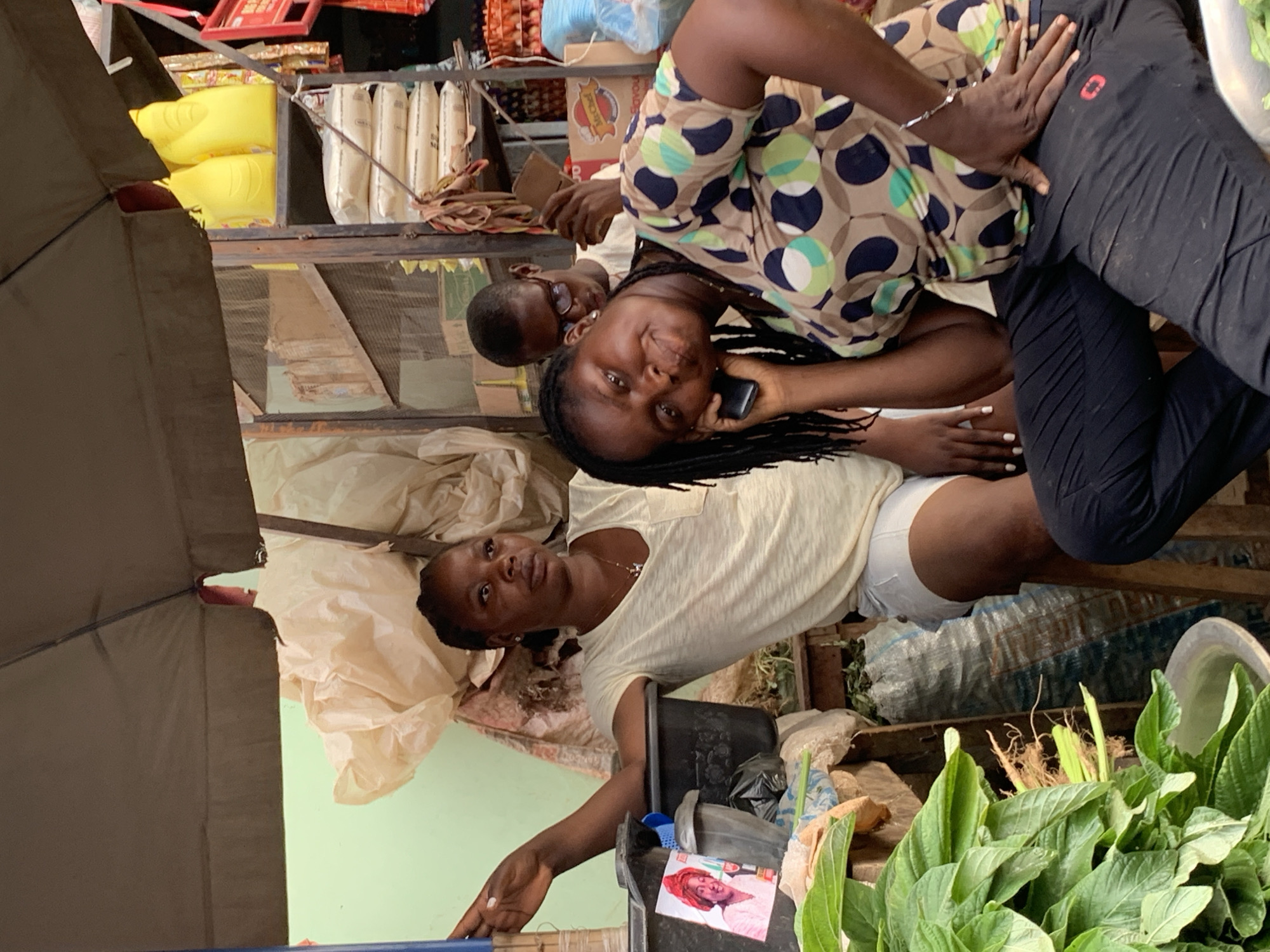 The image captures a market stall scene in Akwanga, Nigeria, situated under a dark-colored awning. Three individuals are present. In the immediate foreground, a woman with dark skin and dark braided hair wears a patterned short-sleeved top featuring brown, green, and dark blue circular motifs, paired with dark pants that display a small red logo on the right thigh. She holds a black smartphone to her right ear, appearing to be on a call, and looks directly towards the viewer with a slight head tilt. Her right hand rests on her hip, and a silver bracelet is visible on her left wrist. To her left, a second woman with dark skin and dark hair pulled back wears a light beige short-sleeved t-shirt with a v-neck and a small left chest pocket, along with white shorts. She rests her left arm on the rim of a black plastic container, looking slightly towards her left. A small color photograph of an older woman with a red headwrap and light-colored attire is affixed to the side of this black container. In the background, positioned behind the foreground woman and partially obscured, a third individual wearing glasses and a light-colored top is seen holding a brown object, possibly a wallet or small notebook, and looking down at it. The immediate left foreground features a silver-colored basin containing a large bundle of fresh green leafy vegetables with visible roots. The background environment consists of a light green painted wall and a multi-shelved wooden and metal unit. On the shelves, visible items include cardboard boxes, two bright yellow plastic bottles on the top shelf, several stacked white sacks (likely containing dry goods) on a middle shelf, and a box labeled "MrChef" on a lower shelf, alongside other miscellaneous items. Large, rumpled light-colored sacks are visible behind the individuals and against the wall.