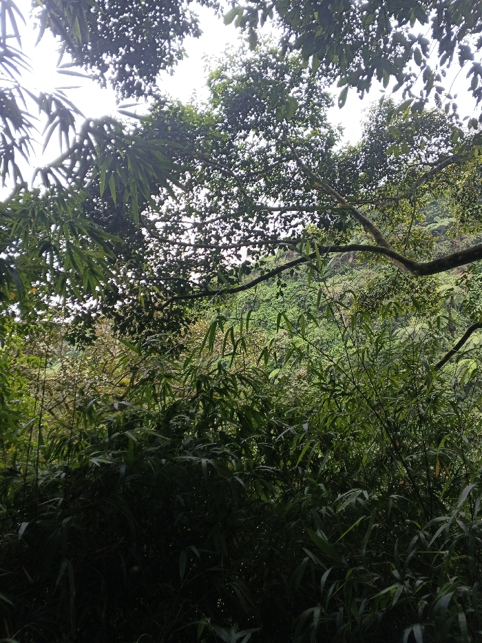 The scene depicts a dense, natural environment within the city of Tamghas, Nepal. The upper portion of the image shows an overcast sky visible through the canopy of large trees with dark green leaves. The midground features a variety of lush green vegetation, including lighter green shrubs and a prominent, gnarled tree branch extending horizontally from the right. The foreground is filled with dense, dark green bamboo foliage, with several leaves exhibiting small droplets of moisture. The background reveals a steep hillside entirely covered in abundant green plant life. No individuals, animals, or man-made structures are present. The lighting is diffused, indicative of an overcast day.