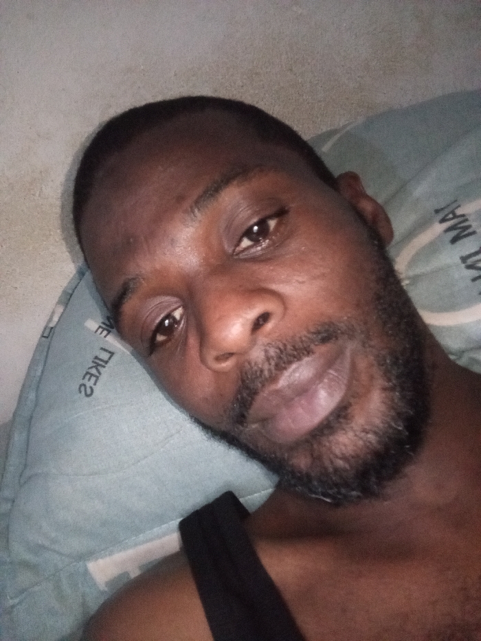 A man lies in bed, resting on a light blue pillow with text printed on it. He has dark skin, short hair, and a beard with gray hairs intermixed. His eyes are open, gazing toward the camera. He wears a black tank top, revealing a portion of his chest and shoulder. The background is a blurred wall.