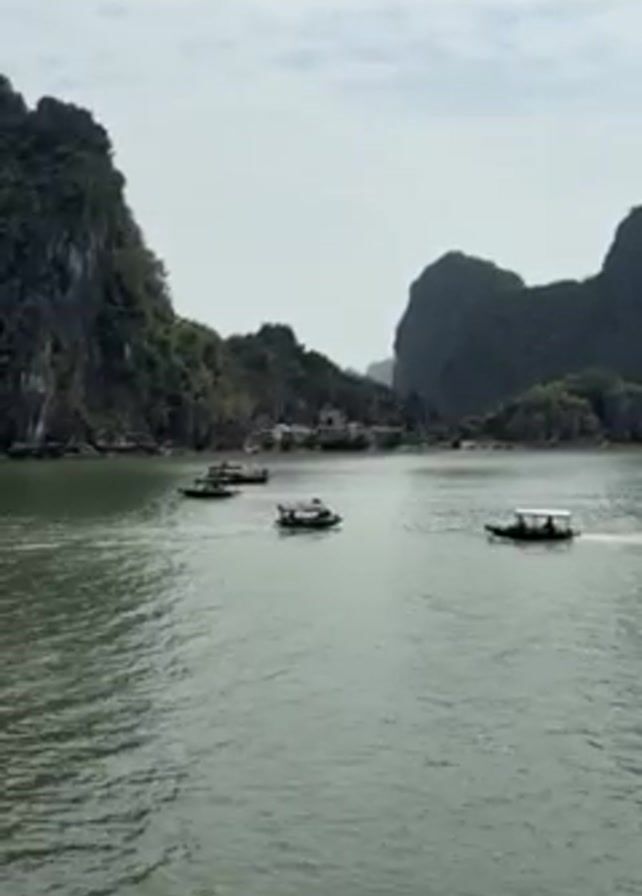 The scene displays a seascape with several small boats moving across the water. The boats, varying in size, appear to be carrying passengers. The sea is calm, with a greenish hue. In the backdrop, there are numerous large, rocky islands covered with vegetation. The sky is overcast, with a flat, greyish-white color, indicating a cloudy day. The camera angle is stable, providing a wide shot of the environment.