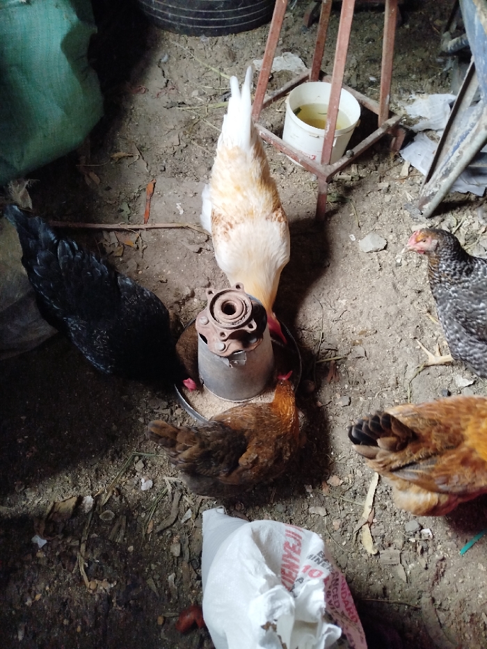 Several chickens gather around a metal feeding container, pecking at the food within. There is a black chicken, a light-colored chicken, a mottled chicken, and two reddish-brown chickens. They are on a dirt floor scattered with debris. A green bag and a bag with printed text are visible near the chickens. A bucket and a metal object stand nearby.
