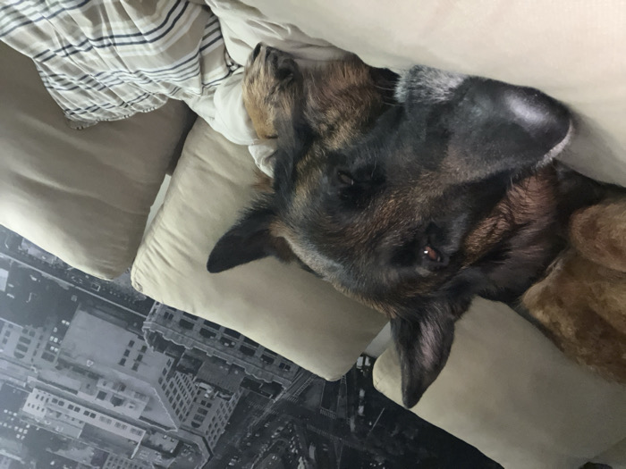A dog rests on a light tan sofa. The dog has dark brown fur with black markings on its head and ears. A striped blanket sits on the back of the sofa and pillows are under the dog's head. A cityscape-themed wallpaper is on the lower left corner of the image. The dog appears relaxed, with its eyes partially open.