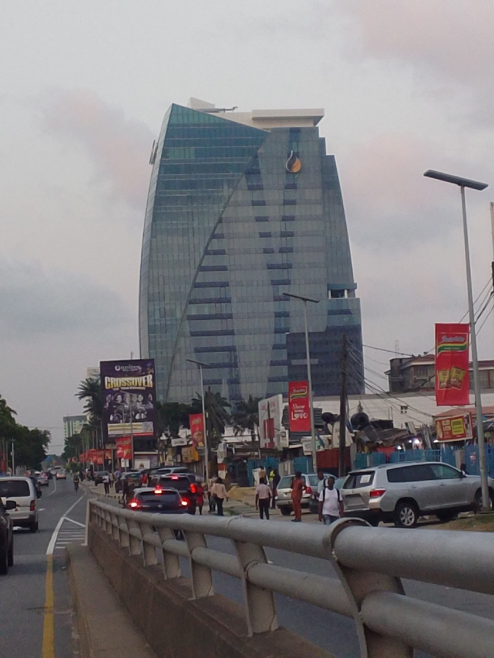 A bustling street scene features a curved, glass-clad skyscraper with a company logo near its top. Traffic congests the road lined with various advertisements and signs, including those for "Crossover" and "Indomie." Pedestrians navigate the scene amidst cars and streetlights, with a metal railing in the foreground partially obstructing the view of the road. The sky is overcast, casting a muted light over the urban environment.