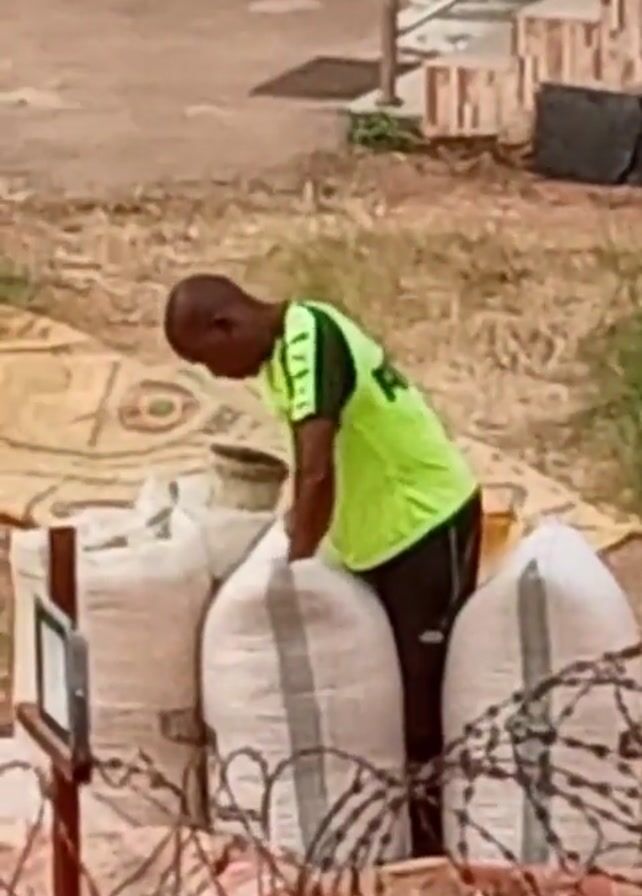 An adult male is interacting with several large white sacks. He is dressed in a neon green short-sleeved t-shirt with black accents and dark pants. The man is bald and appears to be checking inside one of the sacks. There are other sacks nearby and a metal container. Barbed wire is visible in the foreground. The background appears to be a semi-outdoor space with a building visible in the distance. The ground is a mix of dirt and concrete.