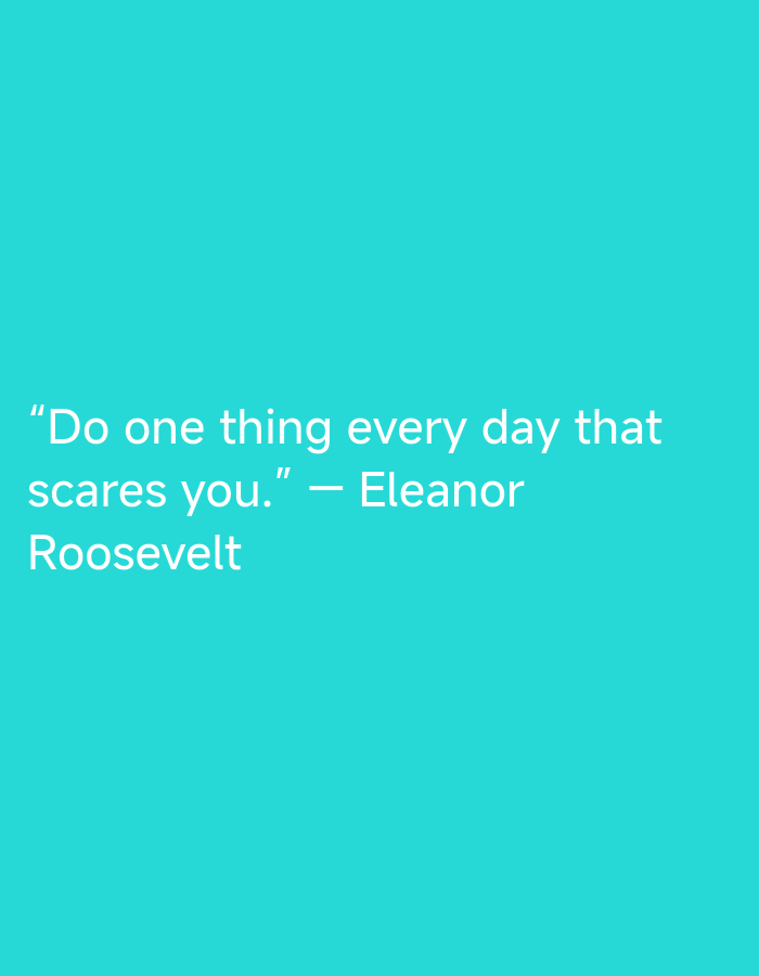 The image displays a solid, uniform cyan background (hex #26D5CC) with white text centrally aligned. The text presents a quote: "Do one thing every day that scares you." followed by the attribution, "— Eleanor Roosevelt". The typography is a sans-serif font. There are no discernible people, subjects, objects other than the text, actions, or interactions depicted. The visual content of the image does not provide any information regarding a physical location, including the city of Gorski Izvor, Bulgaria. The scene is entirely abstract, consisting solely of text on a colored field.