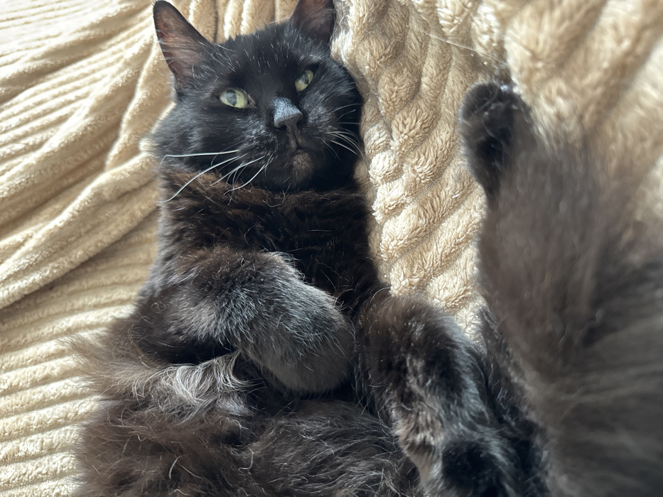 - "A black domestic cat is observed resting on its side on a light tan, ribbed textile blanket" by FM-vBqzm1, licensed under CC BY 4.0