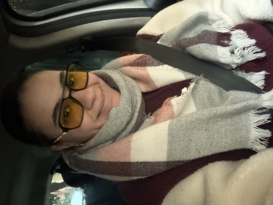 A person with yellow-tinted glasses, wrapped in a striped scarf, is seated in a car wearing a seatbelt. The scarf has a pattern of gray, pink, white, and burgundy stripes. The person has dark hair pulled back and is smiling slightly. The interior of the car is visible, with the roofline and other parts of the vehicle in the background. The person is wearing a dark top, and a white fleece-like blanket is draped around them.