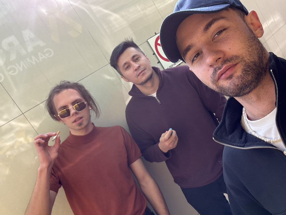 The image depicts three adult males in an indoor public setting within Tashkent, Uzbekistan. The background consists of a light-colored, reflective tiled surface, likely a wall or ceiling, which displays mirror-image reflections of signage including "ART GAMING" and a circular red prohibition symbol with a diagonal line through it. Partially visible Cyrillic text next to the symbol reads "КУРЕНИЕ ПОД НЕ УД...", indicating a "No Smoking" regulation. From foreground to background, the individuals are: 1. A male in the immediate foreground, positioned bottom-right, wearing a dark blue baseball cap, a dark blue zip-up hoodie over a white top, and a white beaded necklace. He has a short beard and is looking directly at the camera. 2. A male in the middle ground, center-left, wearing a dark purple quarter-zip long-sleeve top. He is holding a small blue cylindrical object between the thumb and forefinger of his right hand. He is looking towards the camera. 3. A male in the background, top-left, wearing a rusty red mock-neck long-sleeve shirt and rectangular gold-rimmed sunglasses. He is holding a partially consumed cigarette between the thumb and forefinger of his right hand. He is looking towards the camera. All three subjects appear to be posing for a photograph, likely a selfie taken by the foreground subject, given the angle and proximity.