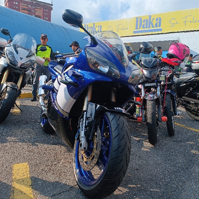 The image displays an outdoor scene in a paved parking lot located in Carrizal, Venezuela, under a partly cloudy daytime sky. The foreground is dominated by a blue and white Yamaha YZF-R series sport motorcycle, positioned centrally. This motorcycle features blue-painted wheels, visible front disc brakes, and a chrome exhaust system. Its front fairing carries stickers on the windshield, and "YAMAHA" is inscribed on the front fender. To the left, a silver touring or adventure motorcycle is partially visible. The ground is dark asphalt, marked with yellow painted lines. In the midground, multiple individuals and additional motorcycles are present. A man in a neon yellow-green long-sleeved shirt and a dark cap stands near the silver motorcycle, facing towards the center. Another man in a dark cap is visible behind the windshield of the blue Yamaha. To the right of the central motorcycle, a black streetfighter-style motorcycle is visible, and another motorcycle further back has a bright pink helmet resting on its handlebars. The background features a prominent large yellow commercial building with the name "Daka" and the phrase "Sé Feliz" (Be Happy) written in large blue letters. To the left of this building, a large blue structure is visible, possibly part of a canopy or another building. Further in the distance, a multi-story brown building with windows is present, indicating an urban setting.