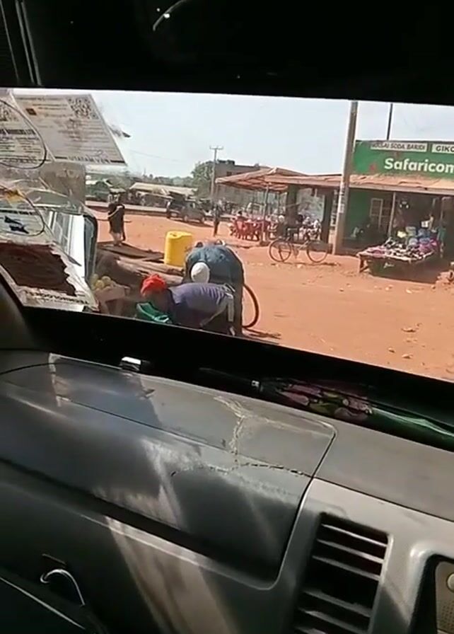 The view is from the front seat of a vehicle, looking out through the windshield at a dusty roadside scene in what appears to be a rural or semi-rural location. Two people are seen working on a bicycle or motorcycle at the side of the road, near a large yellow container. In the background, there are several small shops and stalls. One notable shop has a green sign with white lettering that reads "BALAI SODA BANCHI GIKOMBA Safaricom m-pesa SHOP." Various goods are displayed outside the shops, including shoes and plastic chairs. People are milling around the area, some walking and some sitting at tables under a makeshift roof. The vehicle's dashboard is visible, and a blue sweater lies on the dashboard. A decorative item hangs from the rearview mirror. The overall scene suggests a busy market or trading area in a developing country.