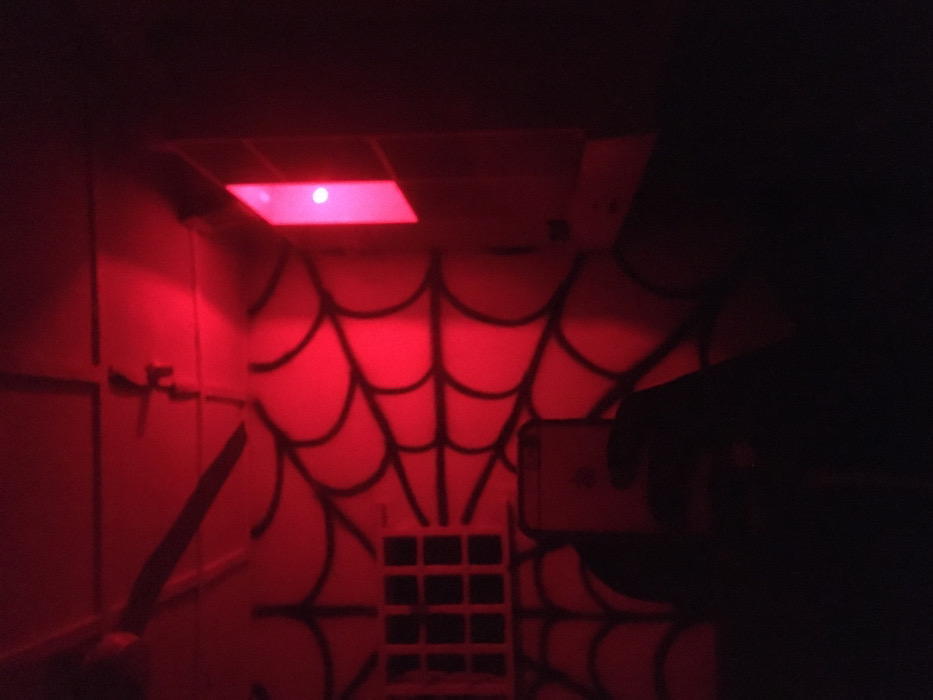 The image depicts an indoor scene saturated in red light, originating from an unknown source. A white wall, adorned with a prominent black spiderweb pattern, occupies the central background. To the left, a small, rectangular window with a grid-like structure is visible, partially obscured by the spiderweb design. In the upper left quadrant, a dark ceiling fan blade is discernible. On the right, a vertical rectangular light fixture emits a concentrated red light, with a distinct brighter circular point within it. In the foreground, a human hand, largely silhouetted against the red illumination, holds an upright smartphone. The phone's rear casing, faintly reflecting the red light, displays the Apple logo. The overall environment suggests a themed room with specialized lighting. The depicted location is an interior space in Jos, Nigeria.