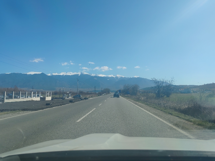 The image presents a forward-facing perspective from inside a vehicle on an asphalt road in Blatino, Bulgaria, under a clear blue sky