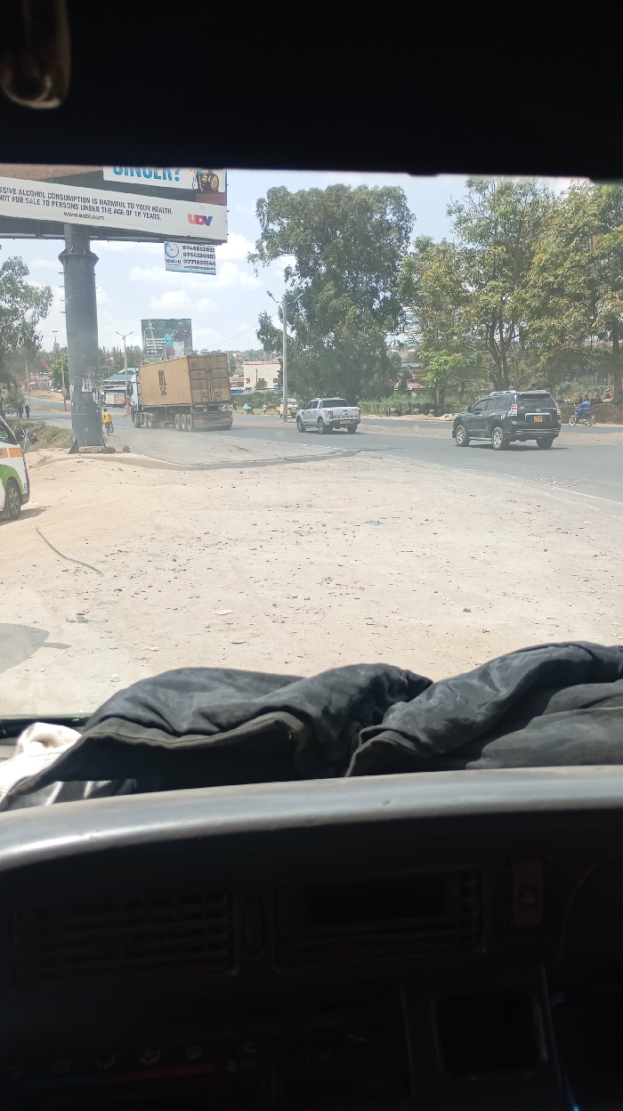 A street scene is viewed from inside a vehicle's dashboard. In the background, a large billboard is visible with an advertisement that includes the text "EXCESSIVE ALCOHOL CONSUMPTION IS HARMFUL TO YOUR HEALTH. NOT FOR SALE TO PERSONS UNDER THE AGE OF 18 YEARS" along with a website address. The advertisement also displays phone numbers. In the distance, traffic is visible, including a truck, SUV, and pick-up truck. Trees line the horizon, and the ground is dirt and gravel.