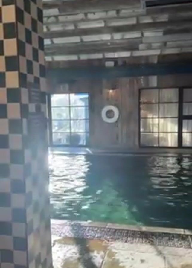 n indoor pool with a tiled column in the foreground. The column has a black and white checkerboard pattern. The pool itself is a light green color and the water is rippling. Beyond the pool, there are two large windows allowing sunlight to filter into the room. Between the windows, a white life preserver hangs on the wall. The wall is made of wooden planks. The ceiling is composed of a series of wooden beams or planks.