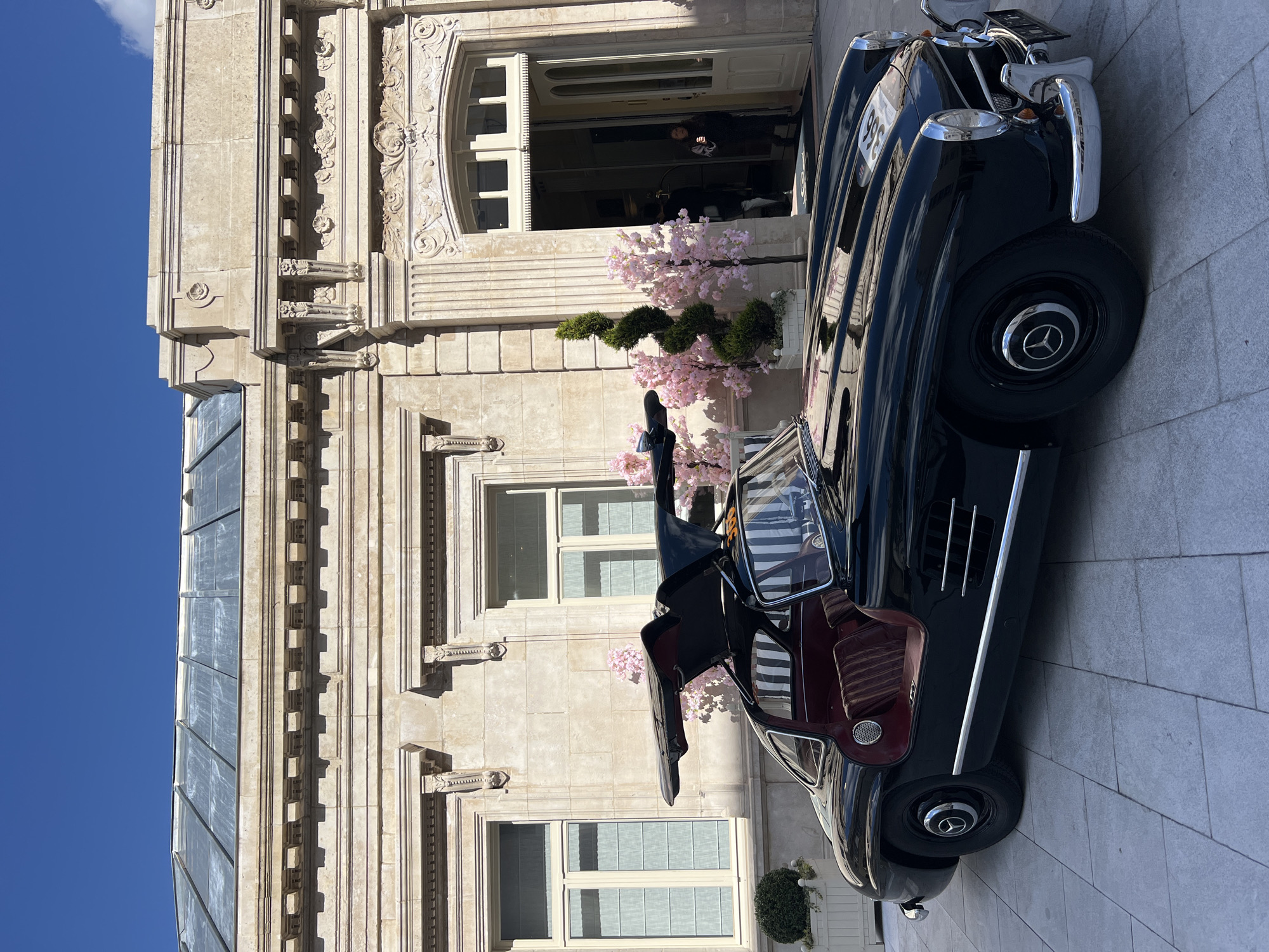 A black Mercedes-Benz 300 SL Gullwing is parked in front of a building with classical architectural details. The car's gullwing doors are open, revealing a red leather interior. Cherry blossom trees flank the car and entrance. In the background, two figures stand in the doorway of the building. The location is likely Spa, Belgium, based on the car's common association with the Spa-Francorchamps race track. The sky is clear blue.