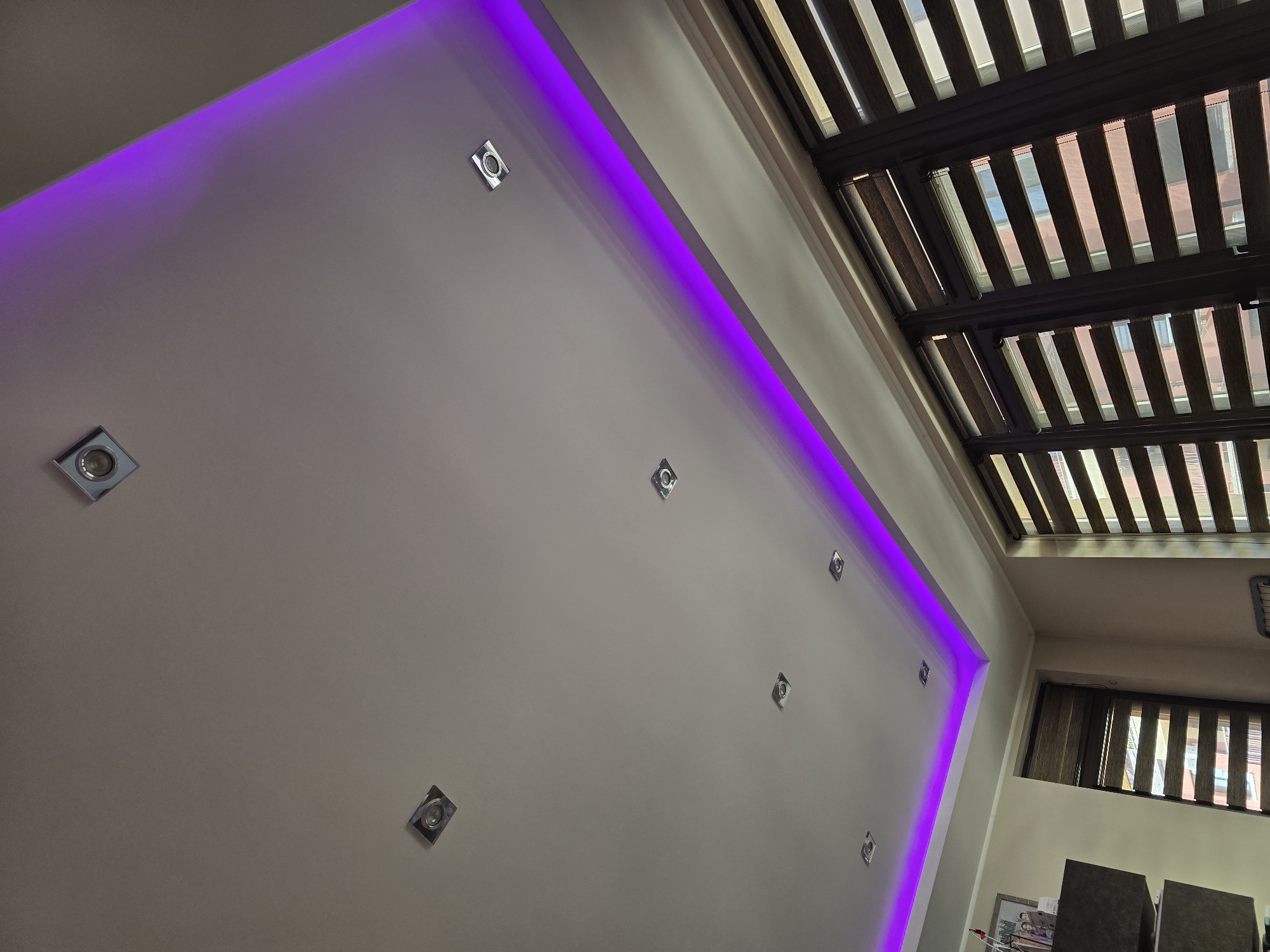 n interior view of a room, likely in a residential or commercial building, with a view towards the ceiling and a portion of an adjacent wall. The wall is painted in a light neutral tone and has a series of recessed square lighting fixtures arranged in a grid-like pattern. A strip of purple LED lighting runs along the top edge of the wall, creating an ambient glow. The ceiling features dark brown wooden slats or beams, possibly part of a skylight structure. The slats are arranged in a parallel fashion, creating a pattern of light and shadow. Between the slats, glimpses of the exterior environment can be seen, indicating daylight and possibly the presence of buildings or sky. A portion of a window or another section of the wall is visible in the lower right corner, featuring vertical blinds. In the foreground, there are hints of furniture or other objects, suggesting that the space is furnished and occupied. The location is stated as Plovdiv, Bulgaria, but there are no specific details in the image that confirm this location definitively. The architectural style and interior design elements suggest a contemporary or modern aesthetic.